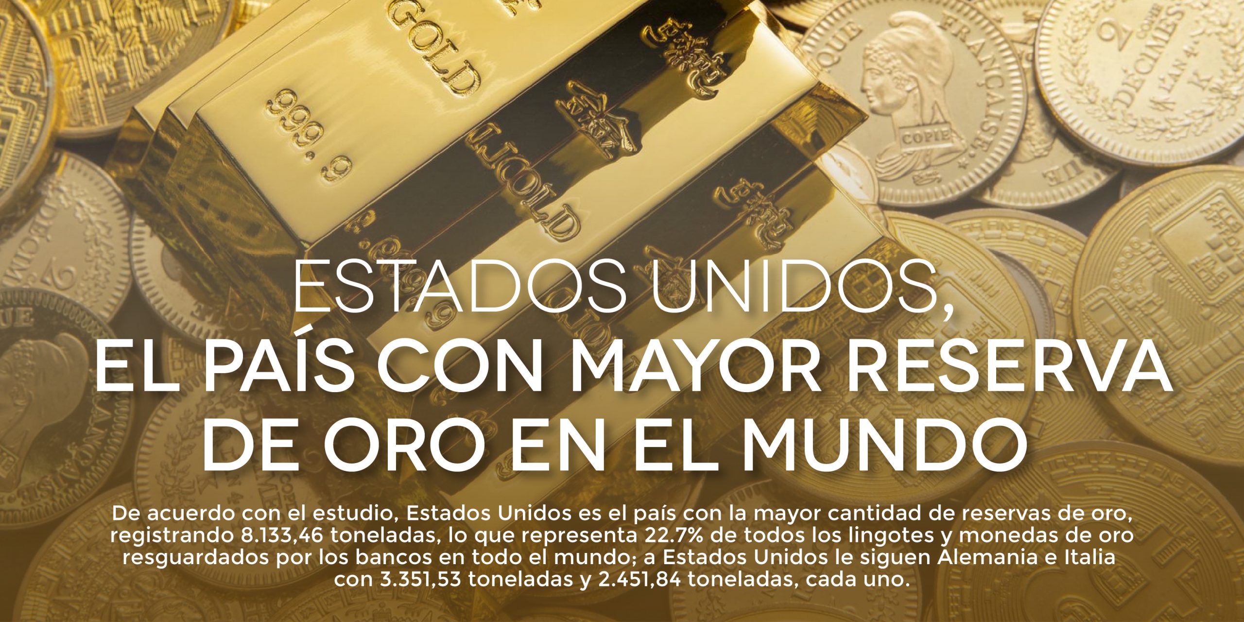De acuerdo con el estudio, Estados Unidos es el país con la mayor cantidad de reservas de oro, registrando 8.133,46 toneladas, lo que representa 22.7% de todos los lingotes y monedas de oro resguardados por los bancos en todo el mundo; a Estados Unidos le siguen Alemania e Italia con 3.351,53 toneladas y 2.451,84 toneladas, cada uno.